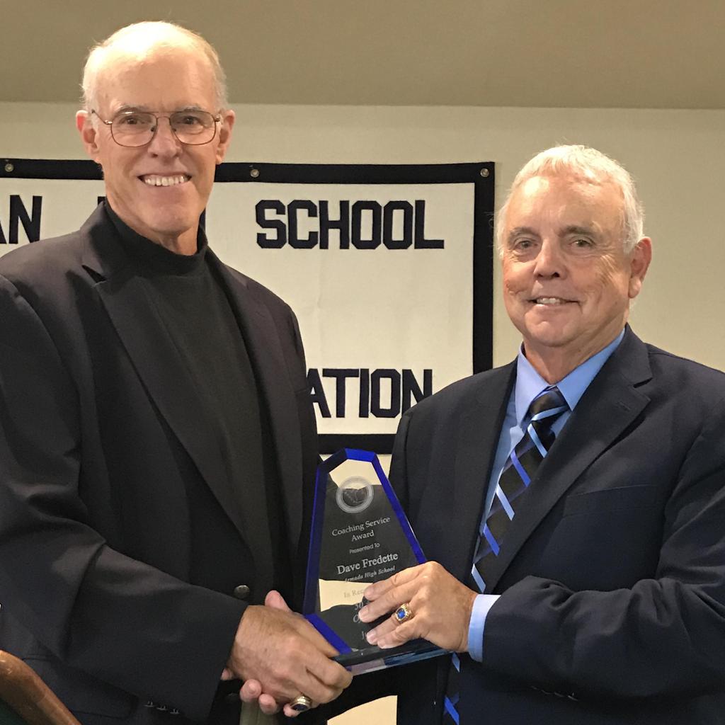 Jim Okler (left), Interim Executive Director presenting a "50 Years of Coaching" Award to Mike Jolly.